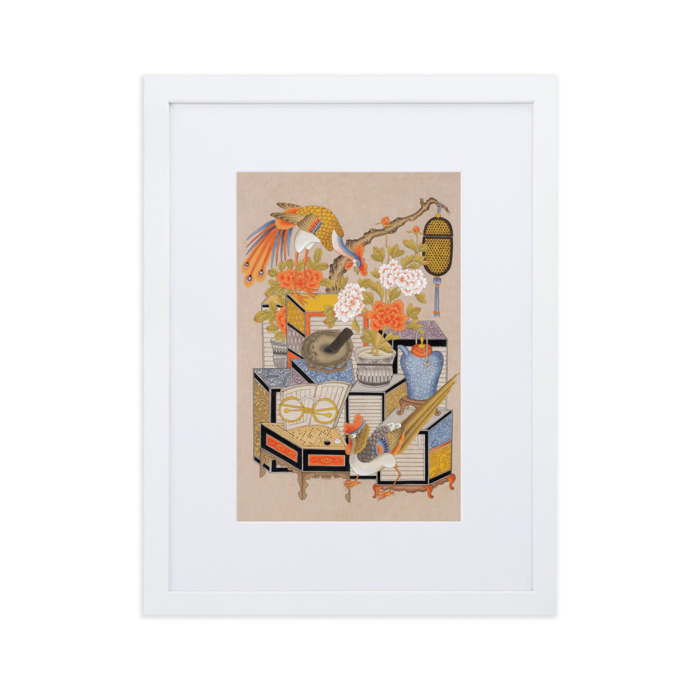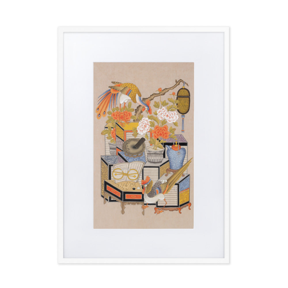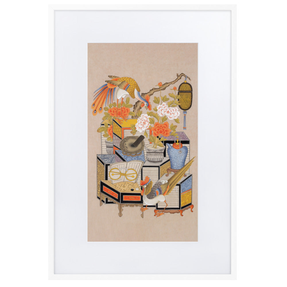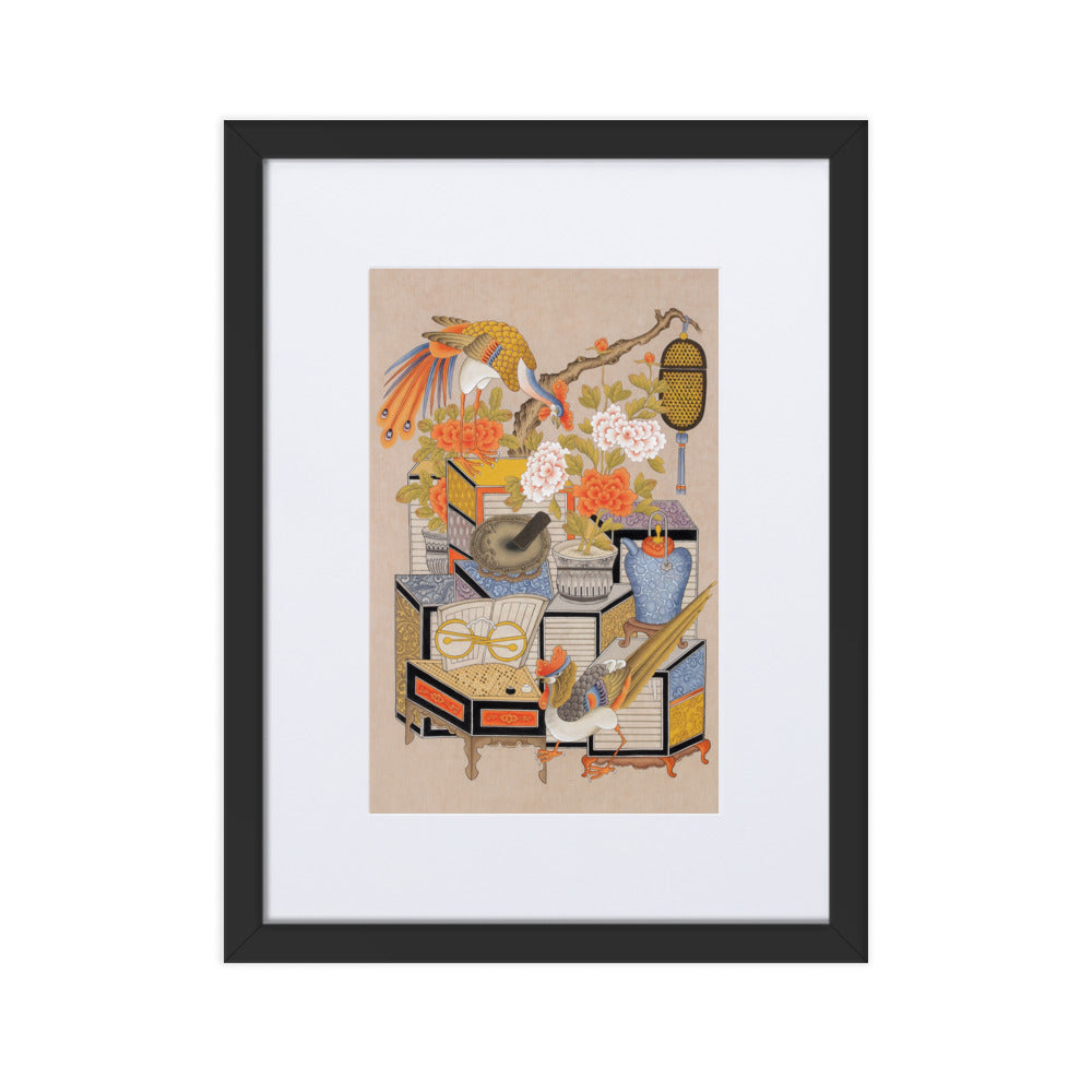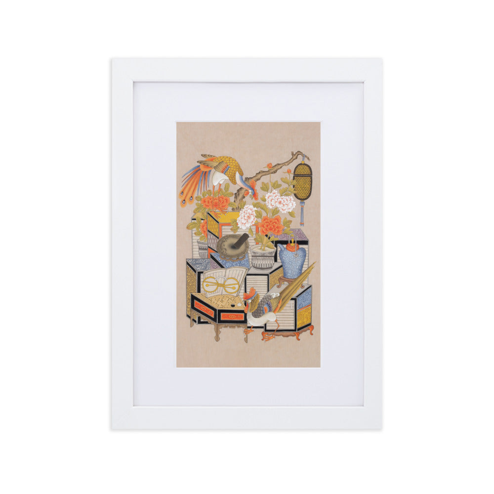 Dieses Werk verbindet traditionelle koreanische Bildsprache mit einer zeitgenössischen Interpretation des Chaekgeori-Motivs – hier verstanden als Sehnsucht nach Wissen.