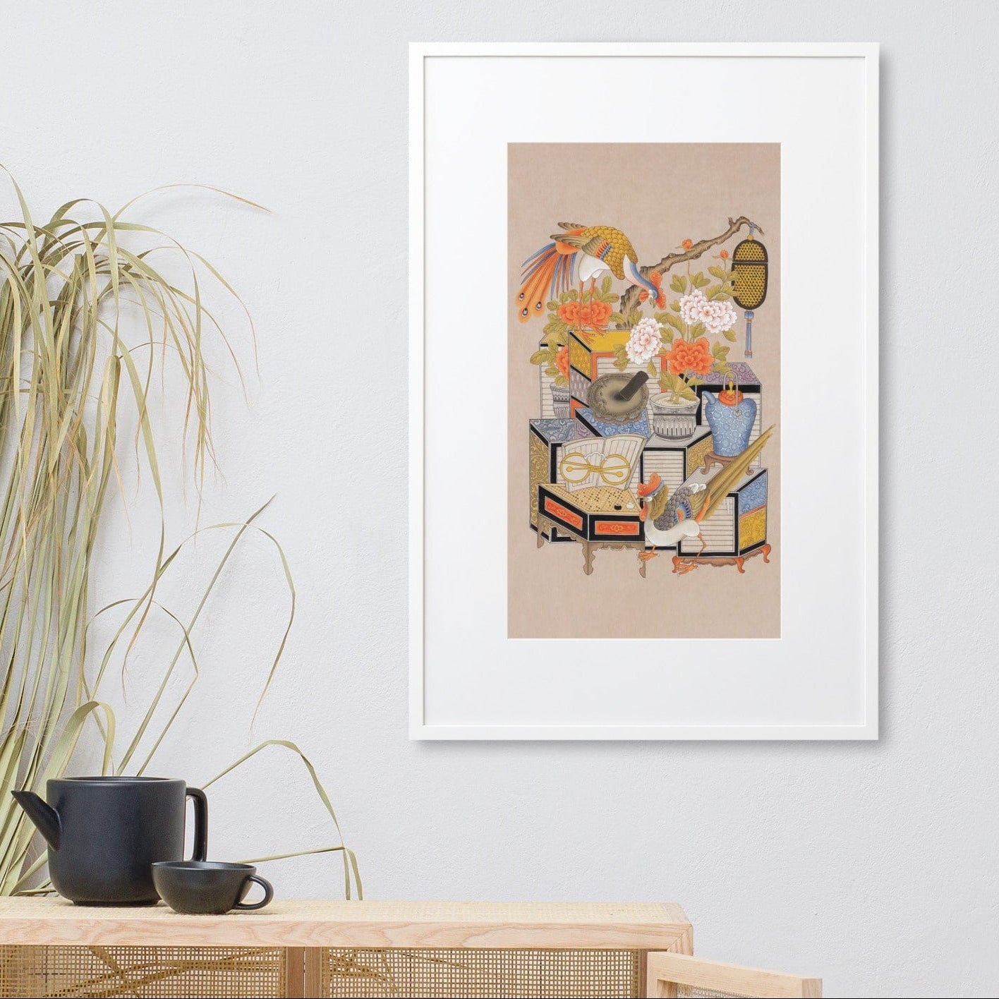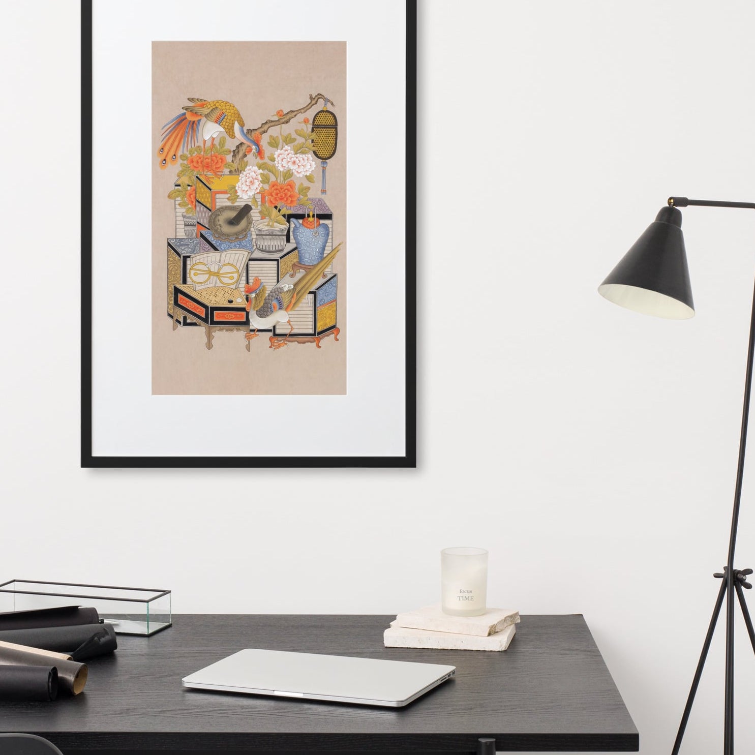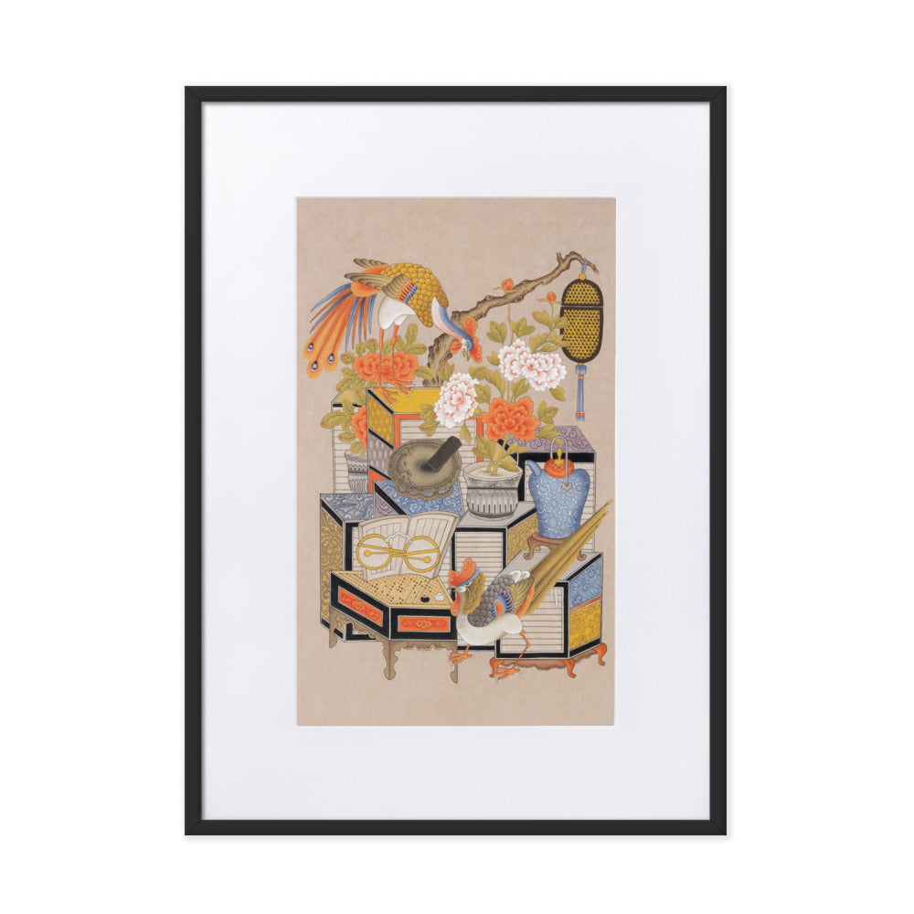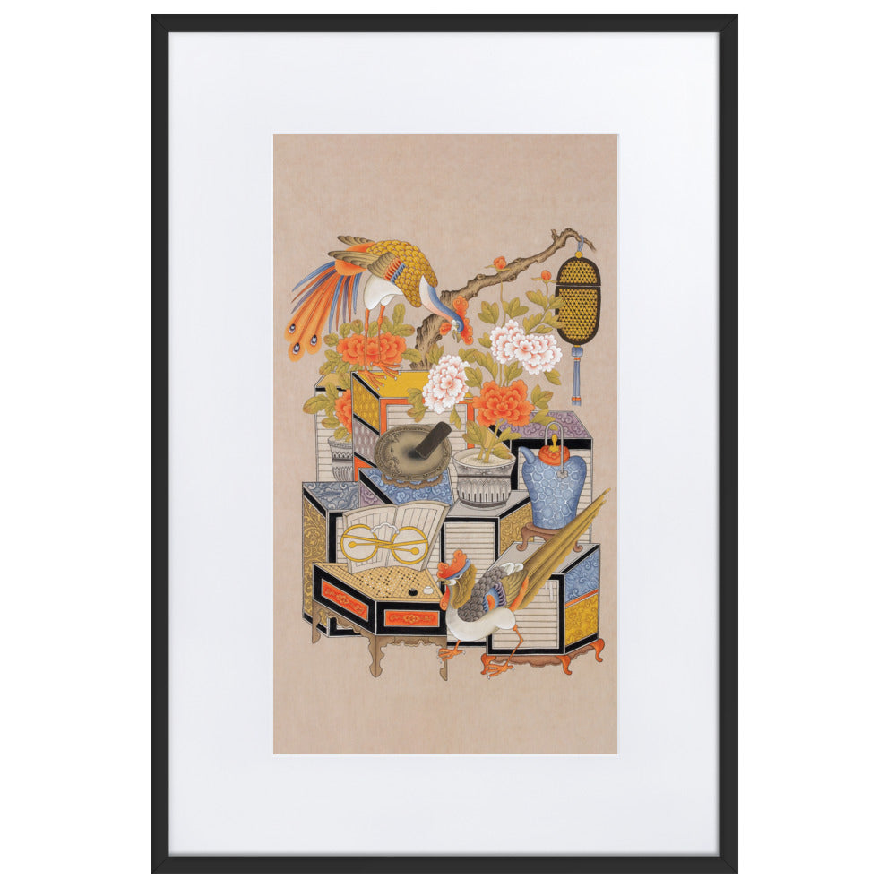 Dieses Werk verbindet traditionelle koreanische Bildsprache mit einer zeitgenössischen Interpretation des Chaekgeori-Motivs – hier verstanden als Sehnsucht nach Wissen.